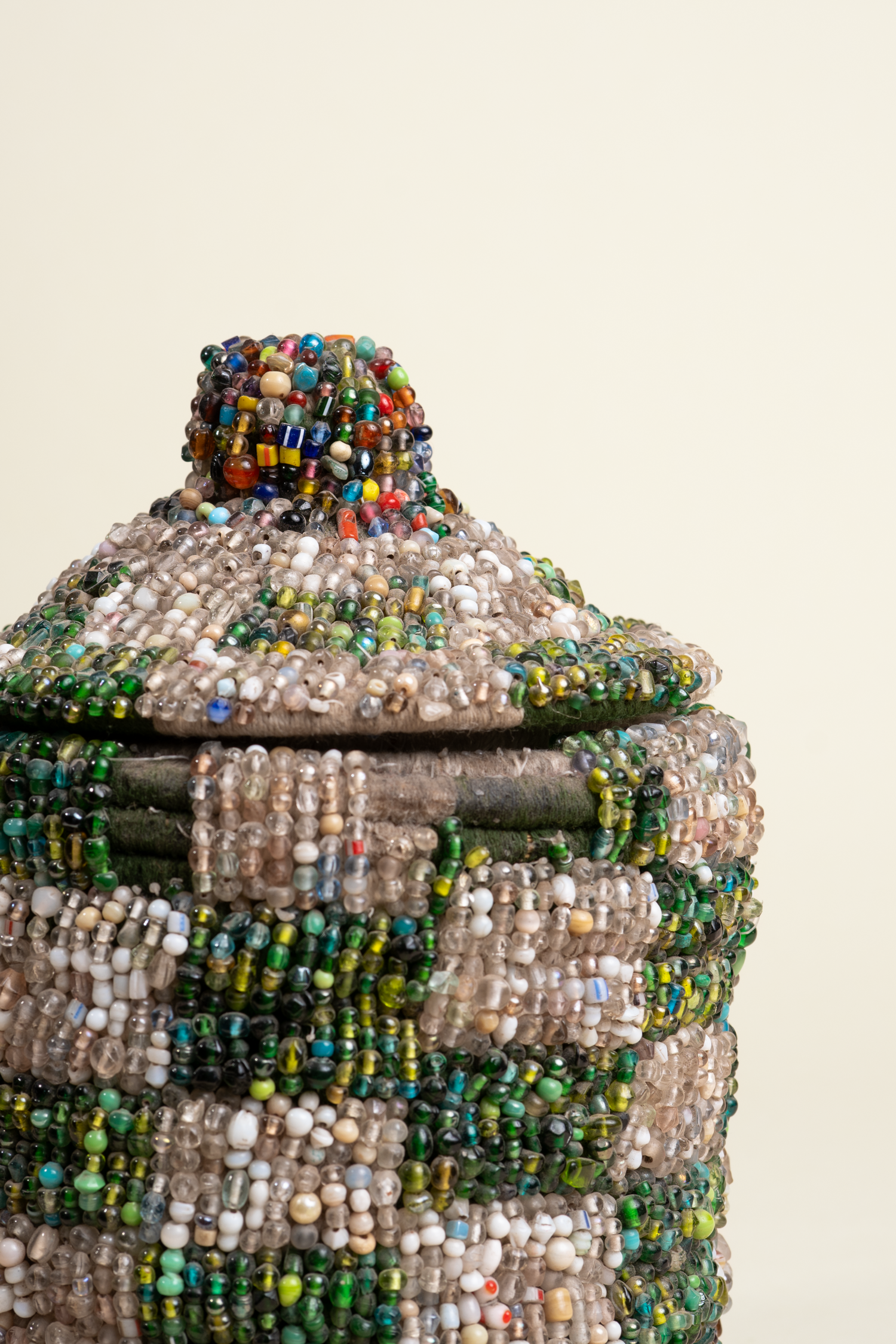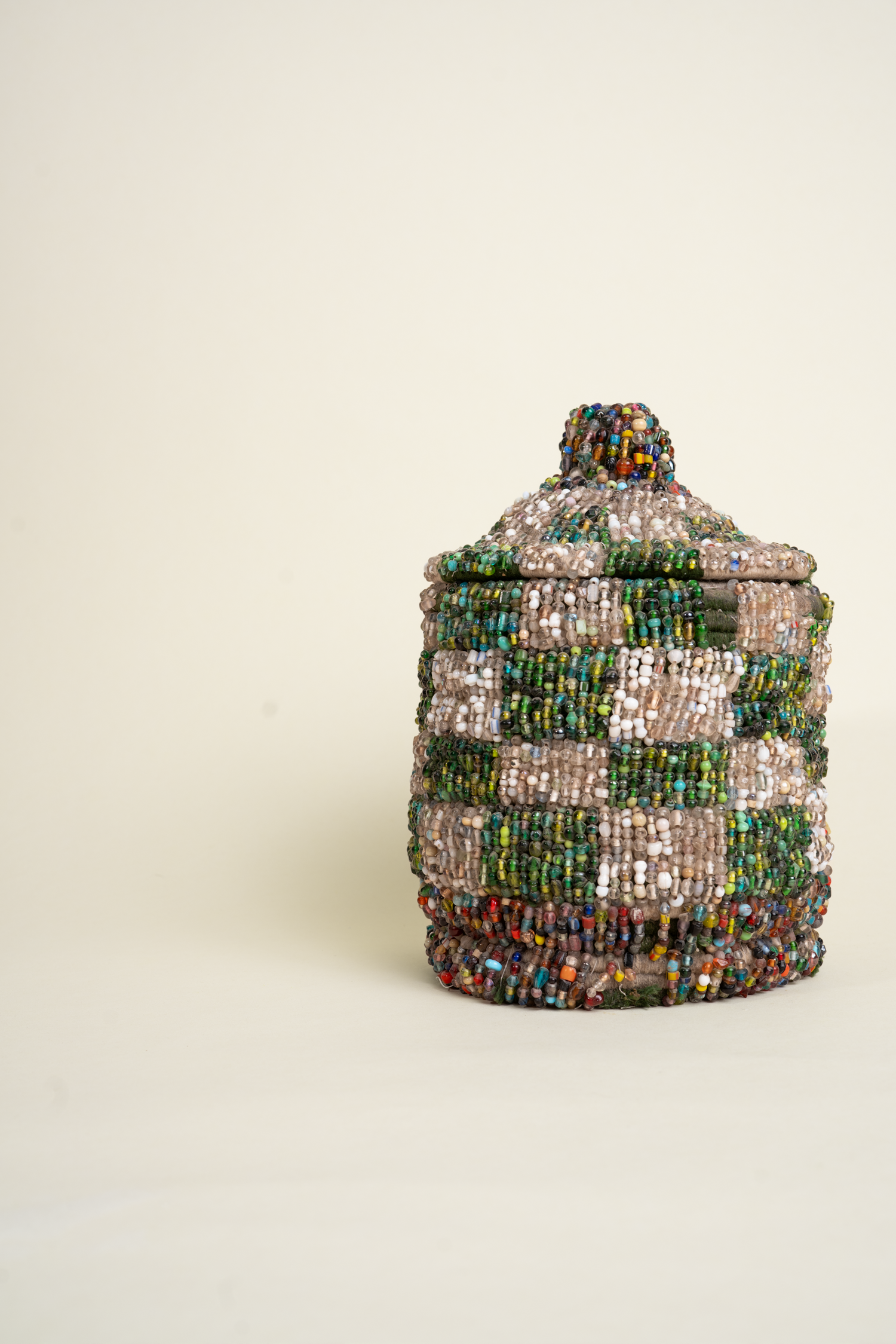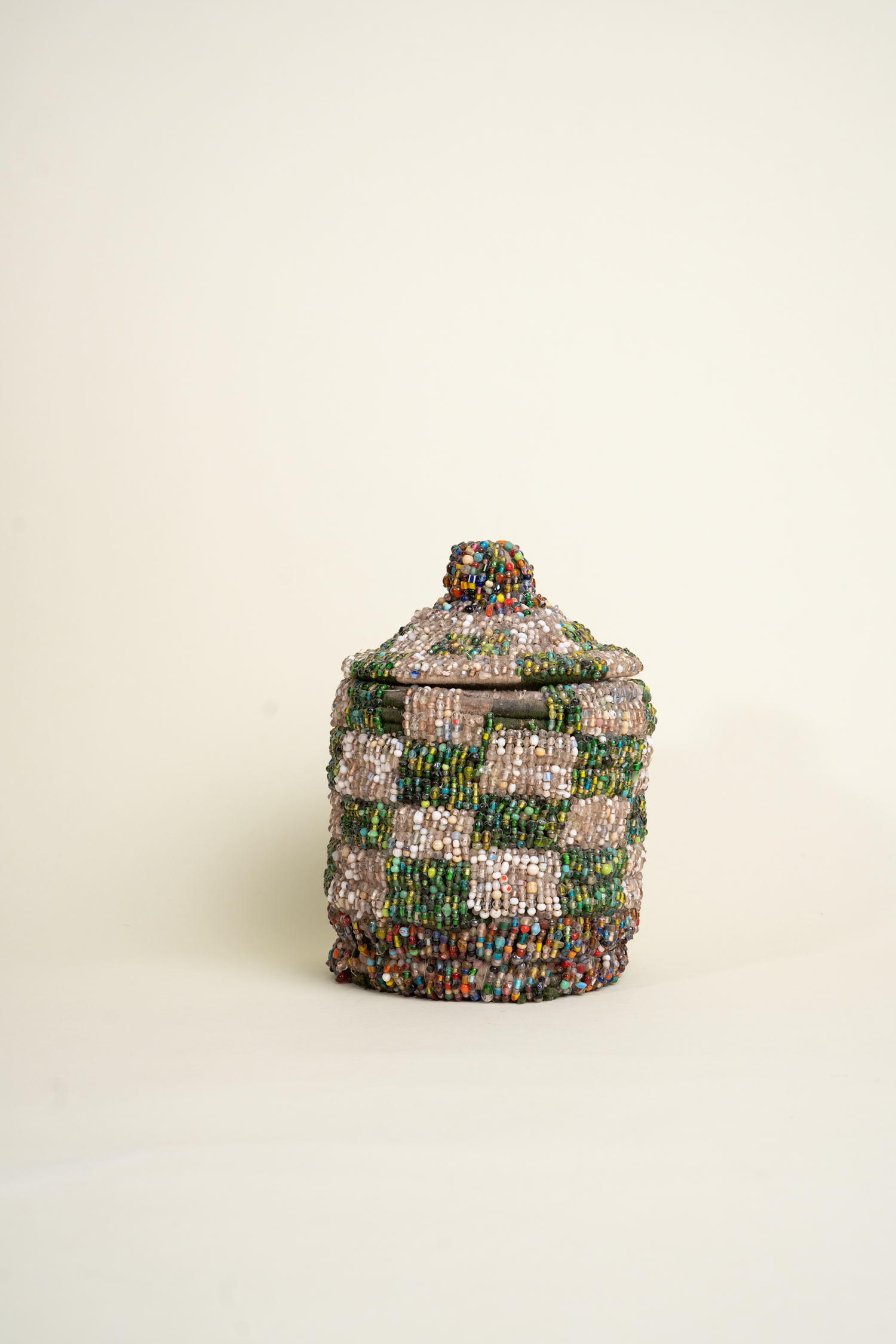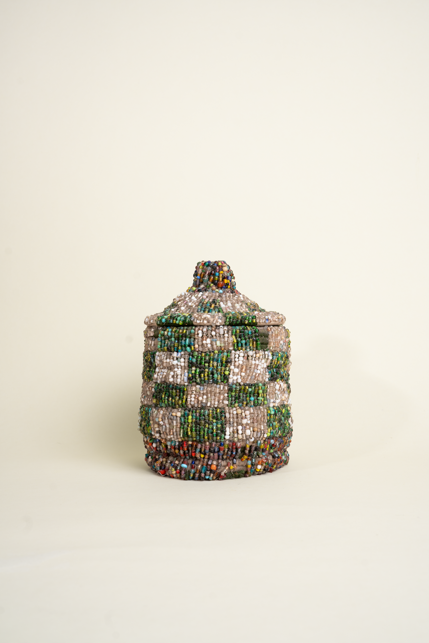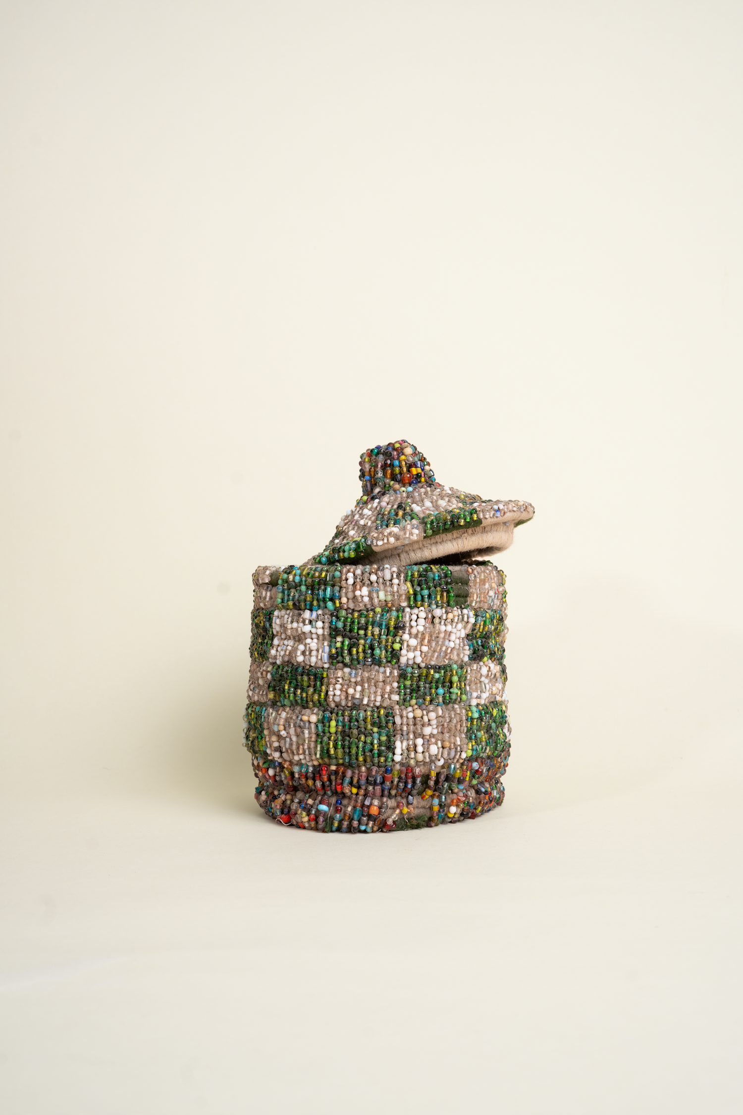 Hand-beaded basket with a bold green and white checkerboard pattern. A playful, detailed piece with irregular charm. Some beads are missing, part of its vintage story and handmade nature.