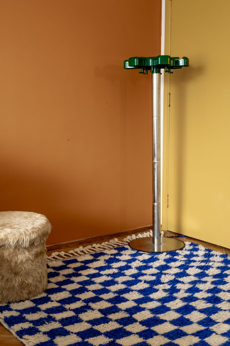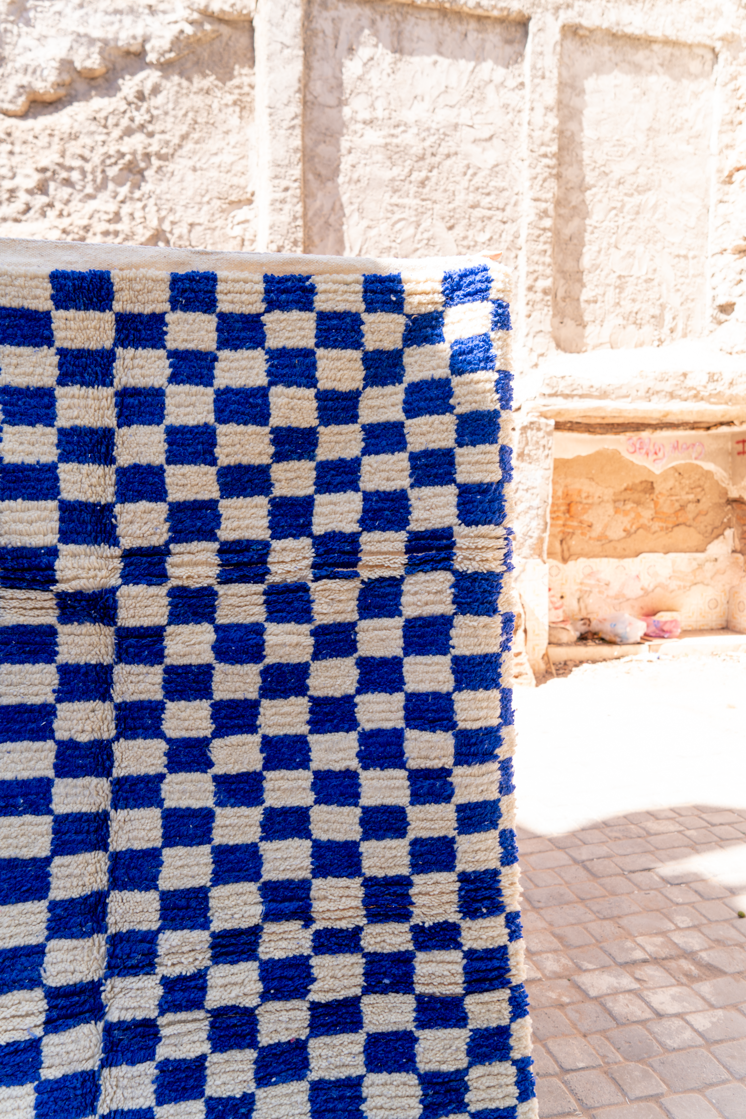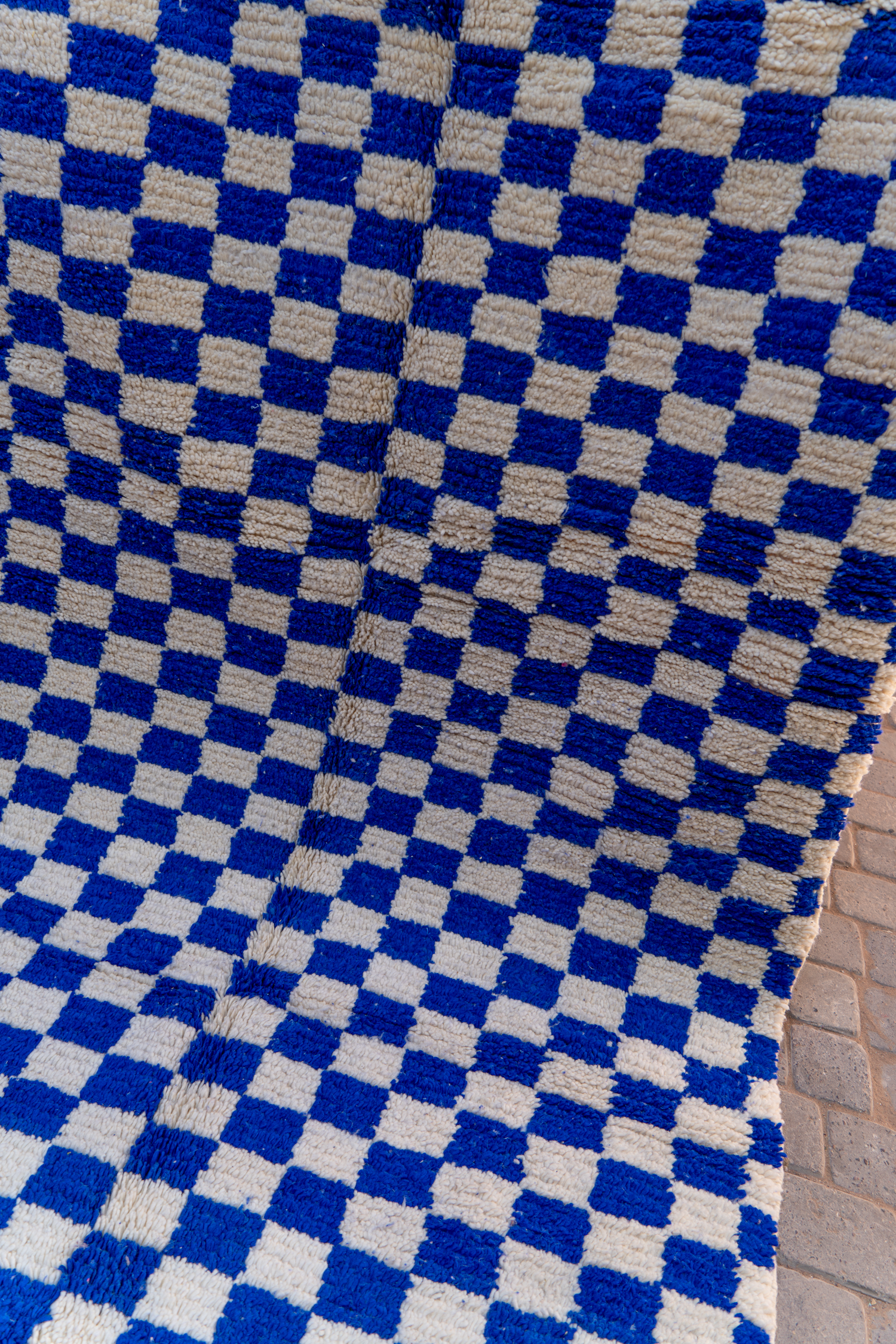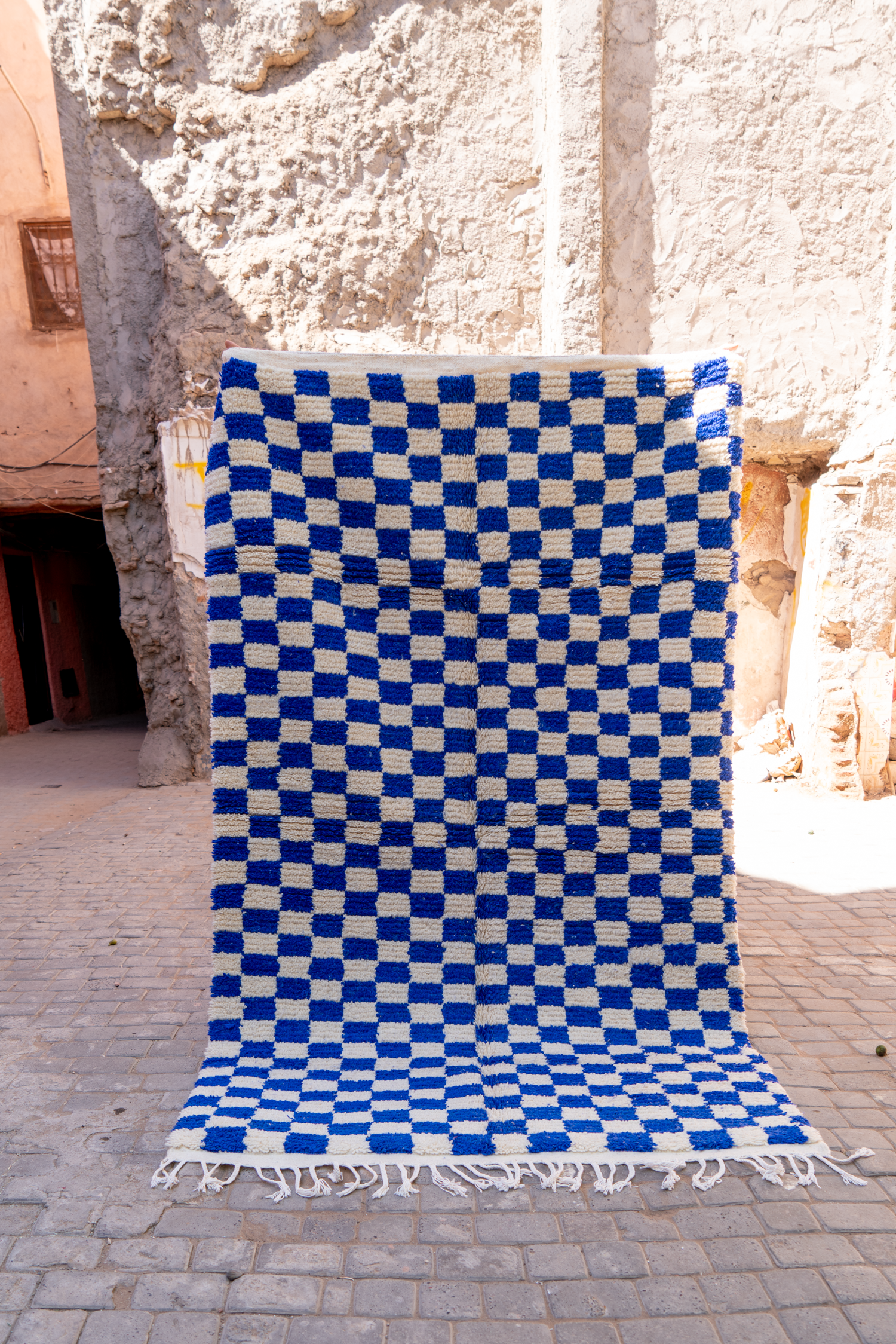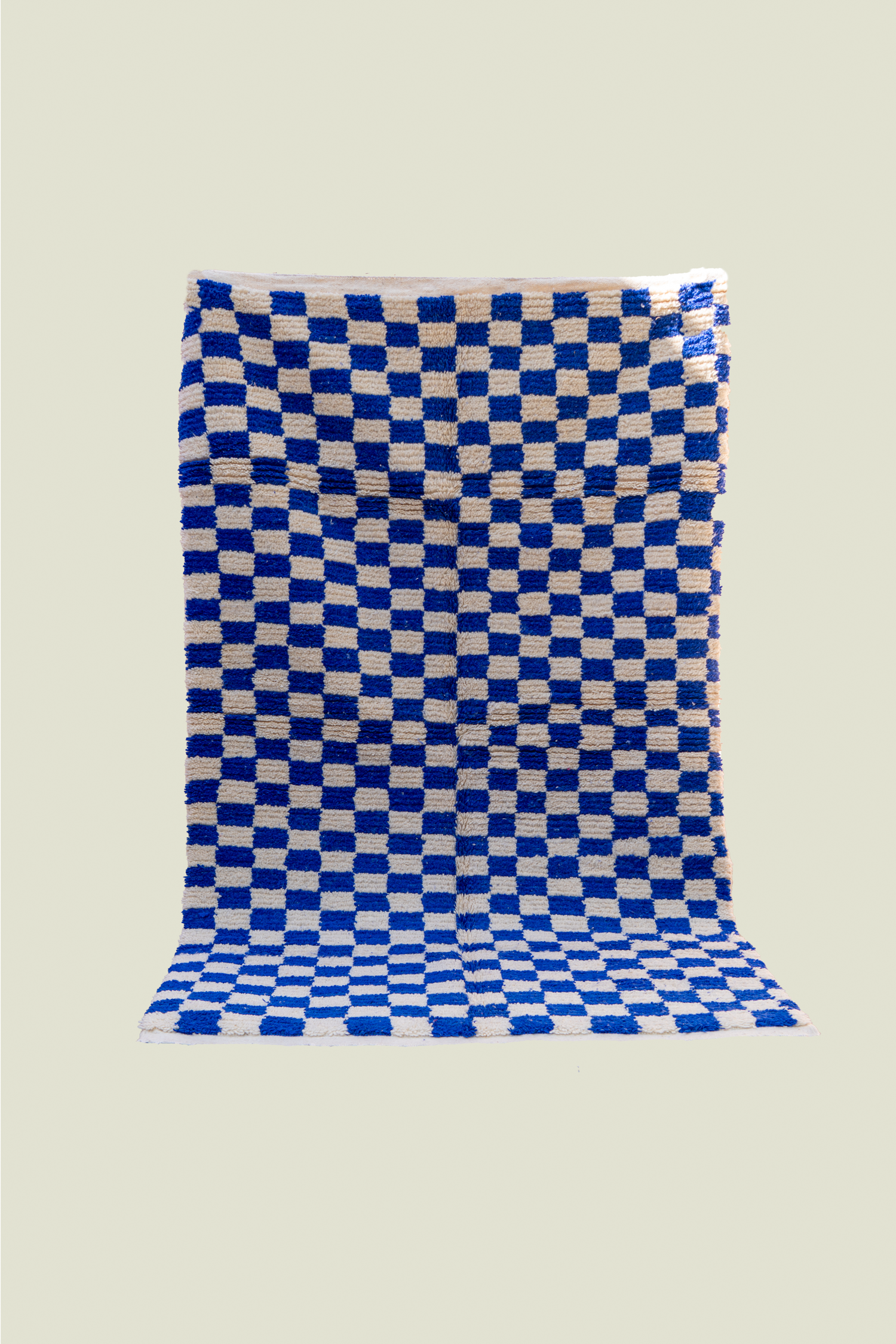 This blue-and-white wool rug plays with contrast and checkered patterns, blending heritage craftsmanship with a modern edge.