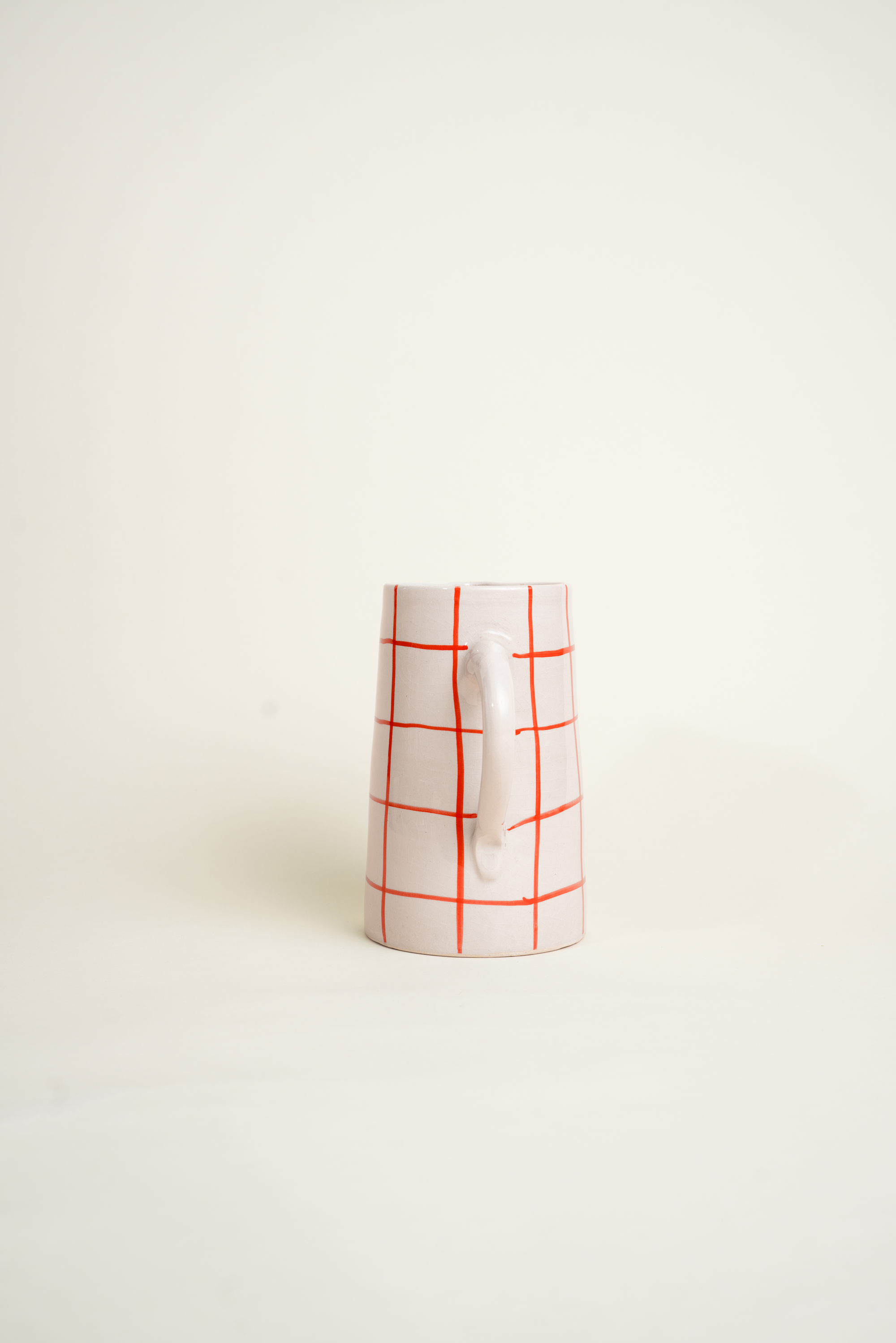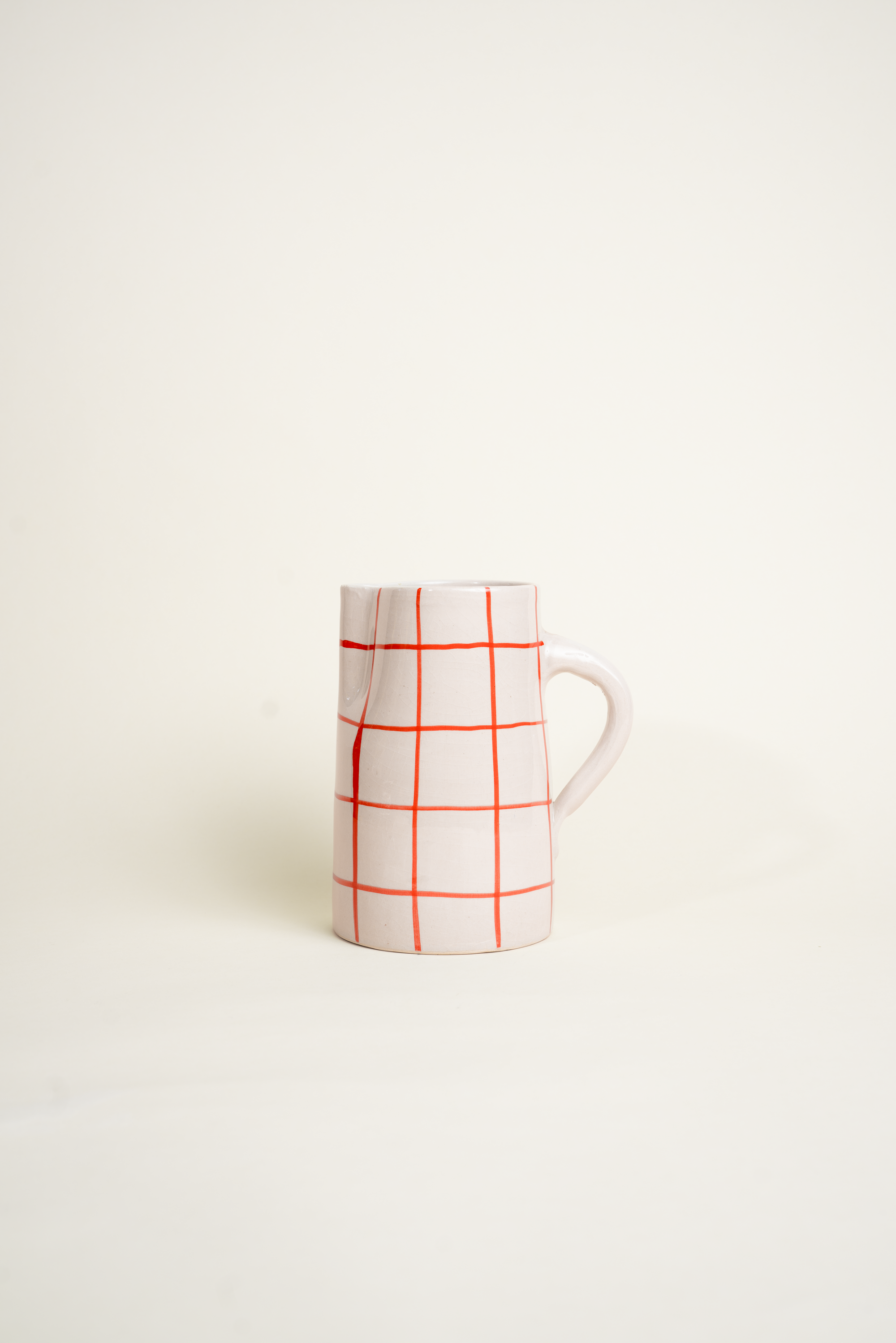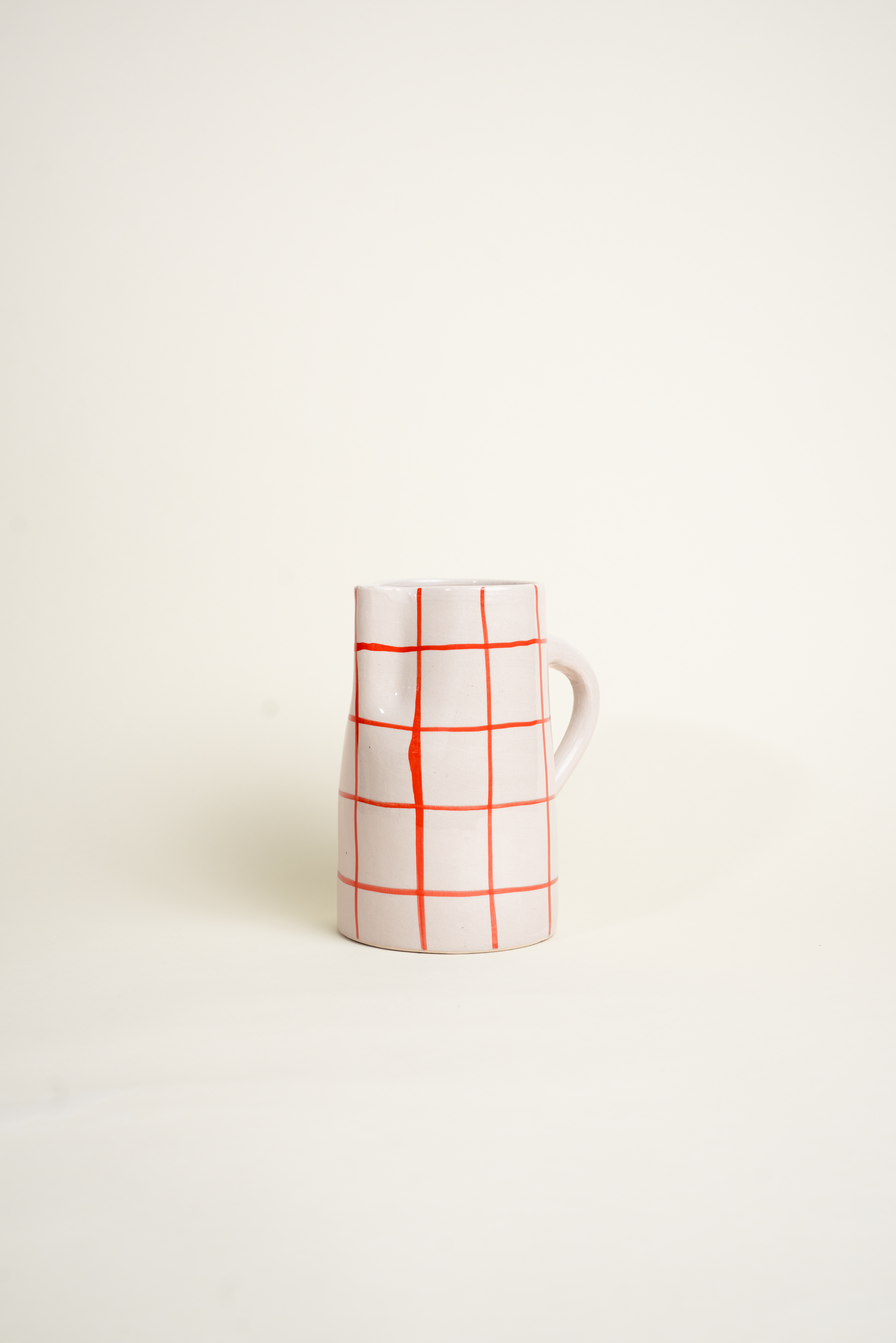 Ceramic pitcher with a hand-painted grid pattern. Made in Morocco, each one with its own slight variation in shape, glaze, or line.