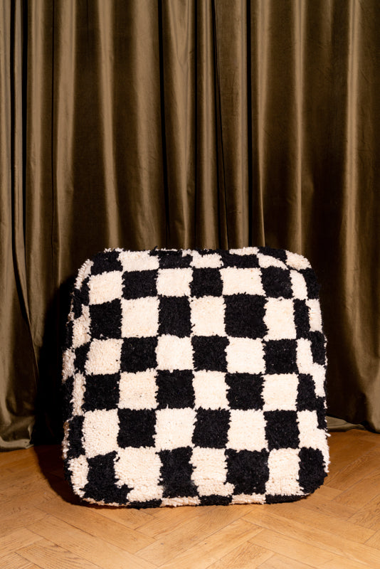 Wool checkered pouf, with black and white checkerboard pattern