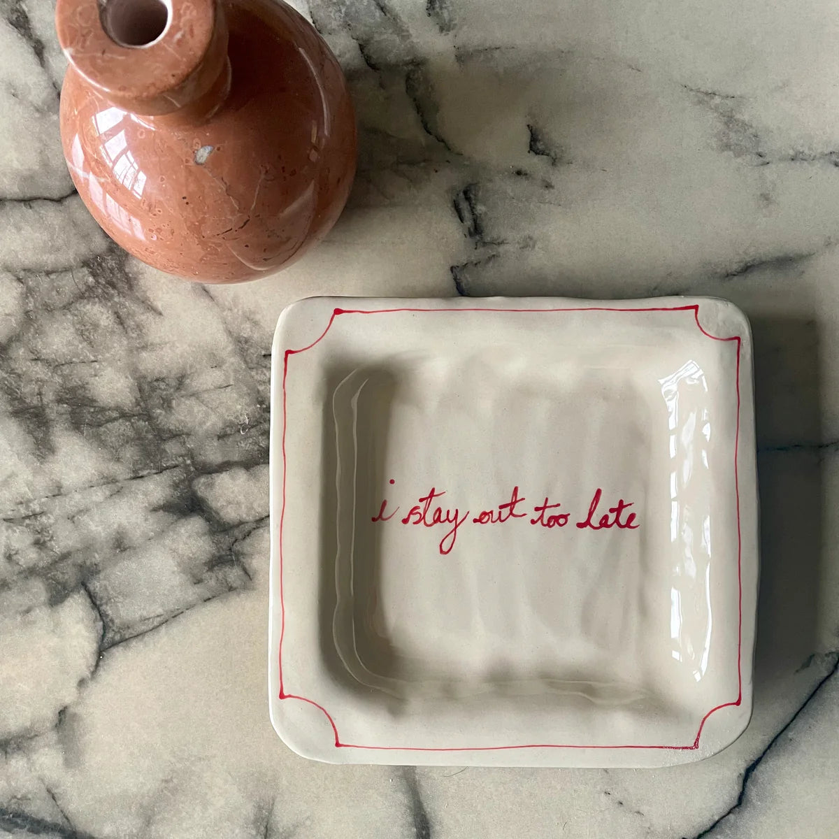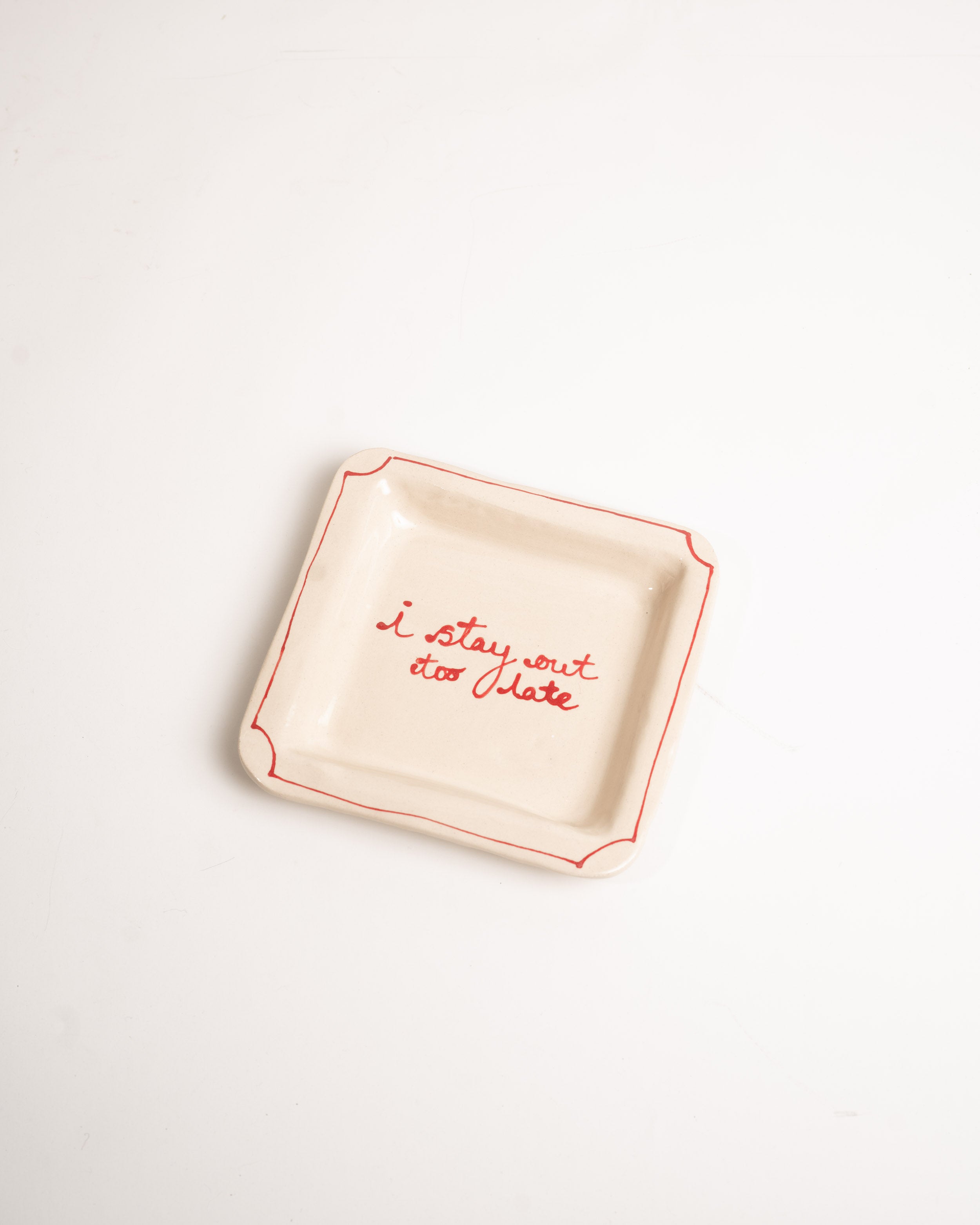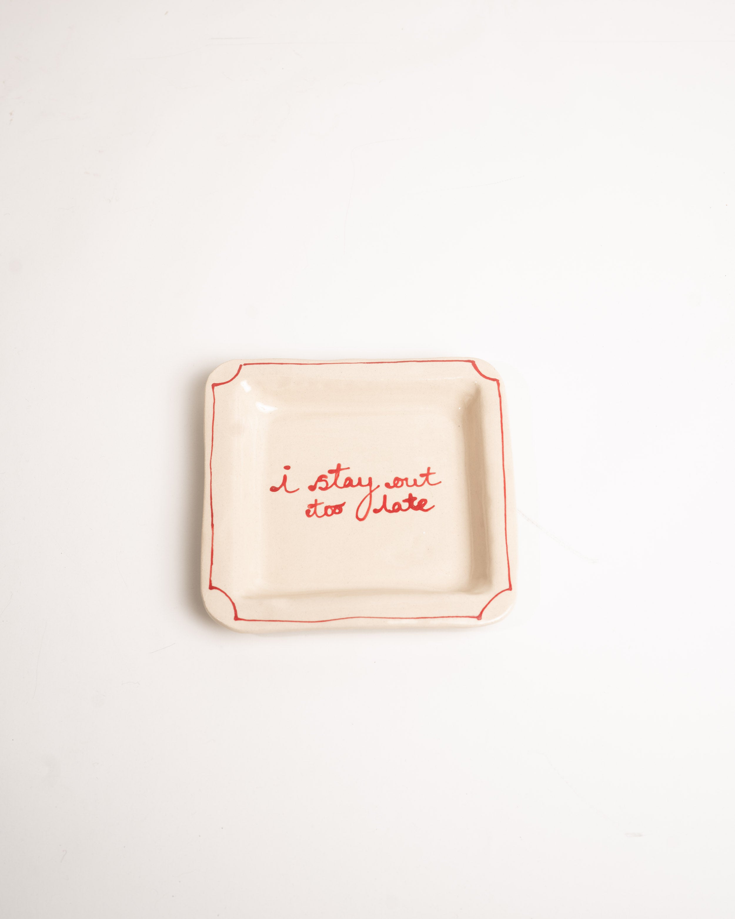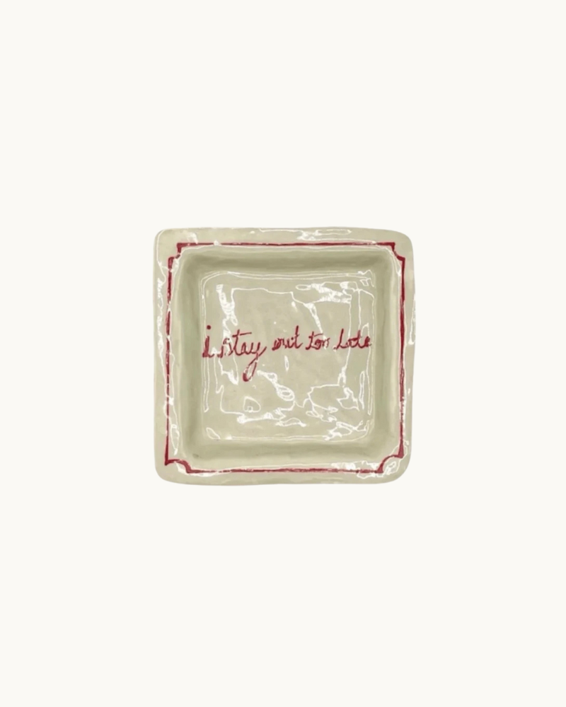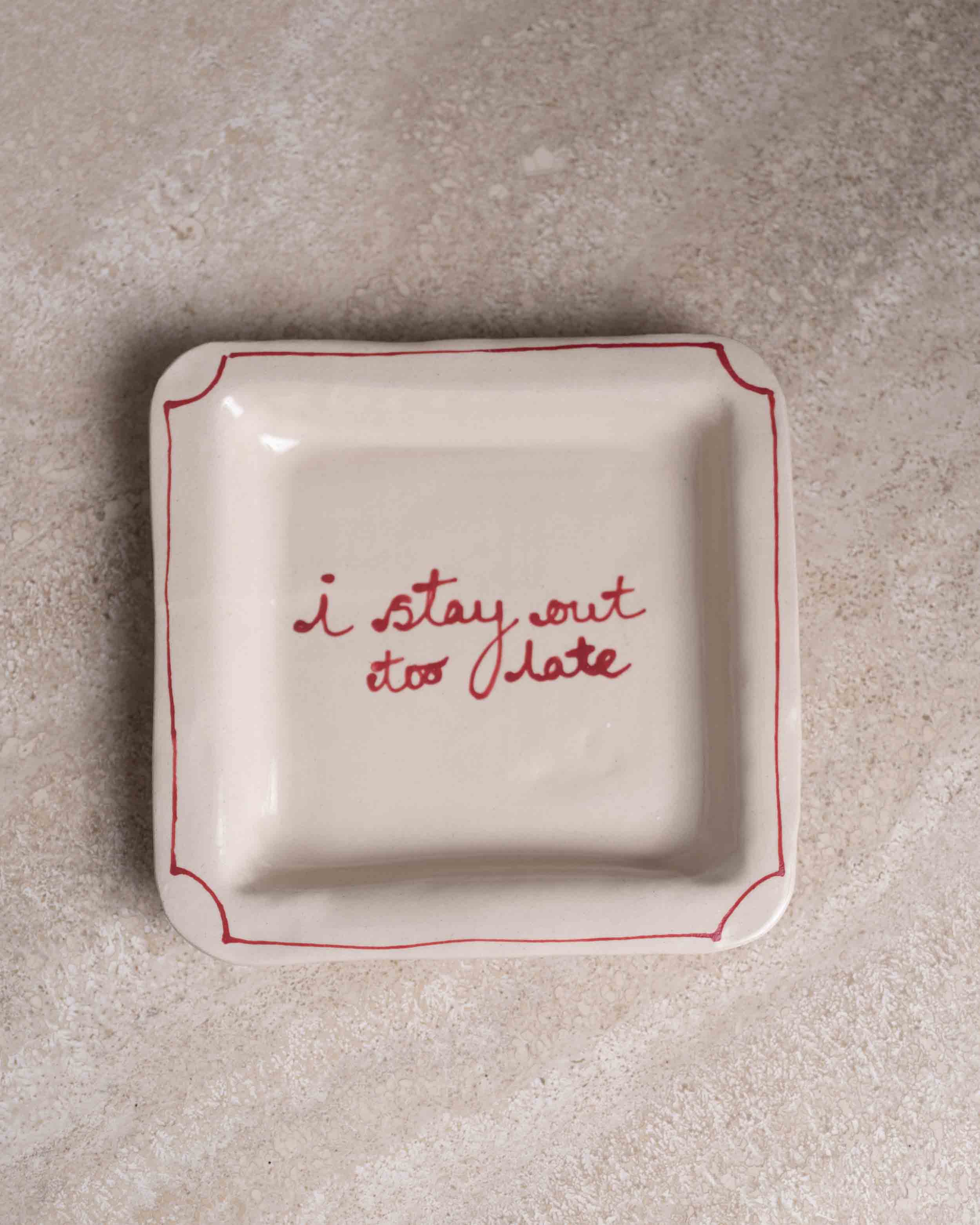 The I Stay Out Too Late Trinket Tray is a signature style by L&Clay Ceramics. A cream square ceramic tray for your keys, jewellery and trinkets, featuring text in red that reads "I Stay Out Too Late"