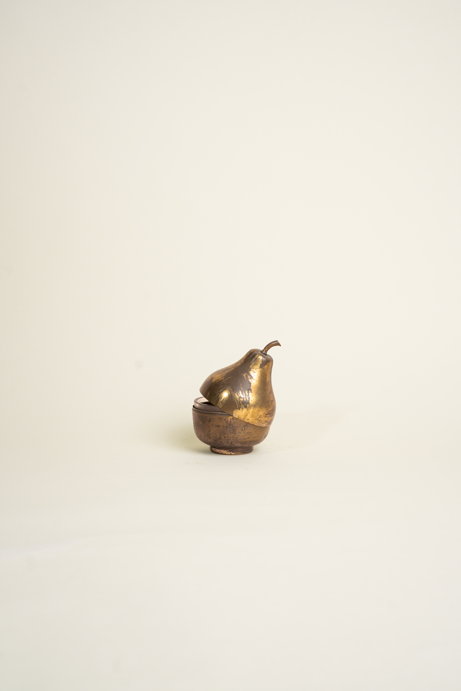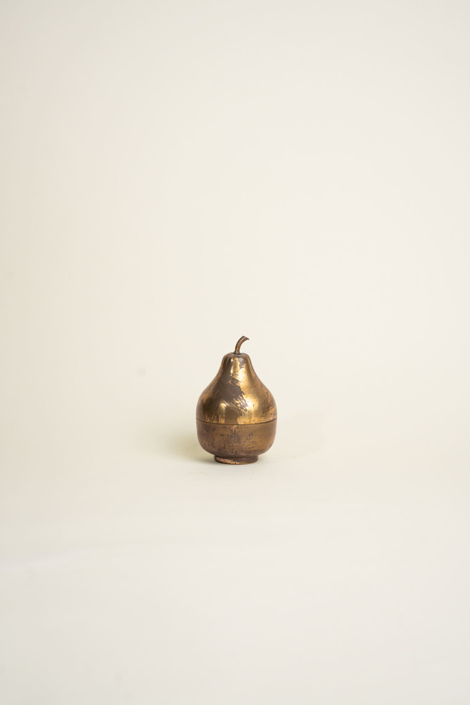 Brass container in the shape of a pear, with a soft golden patina and a quietly sculptural form. Once used as a decorative object or mini ice bucket, now just as at home holding small treasures or adding warmth to a shelf.