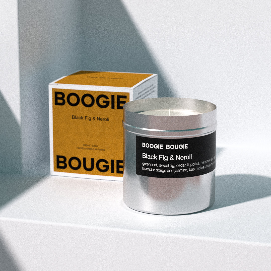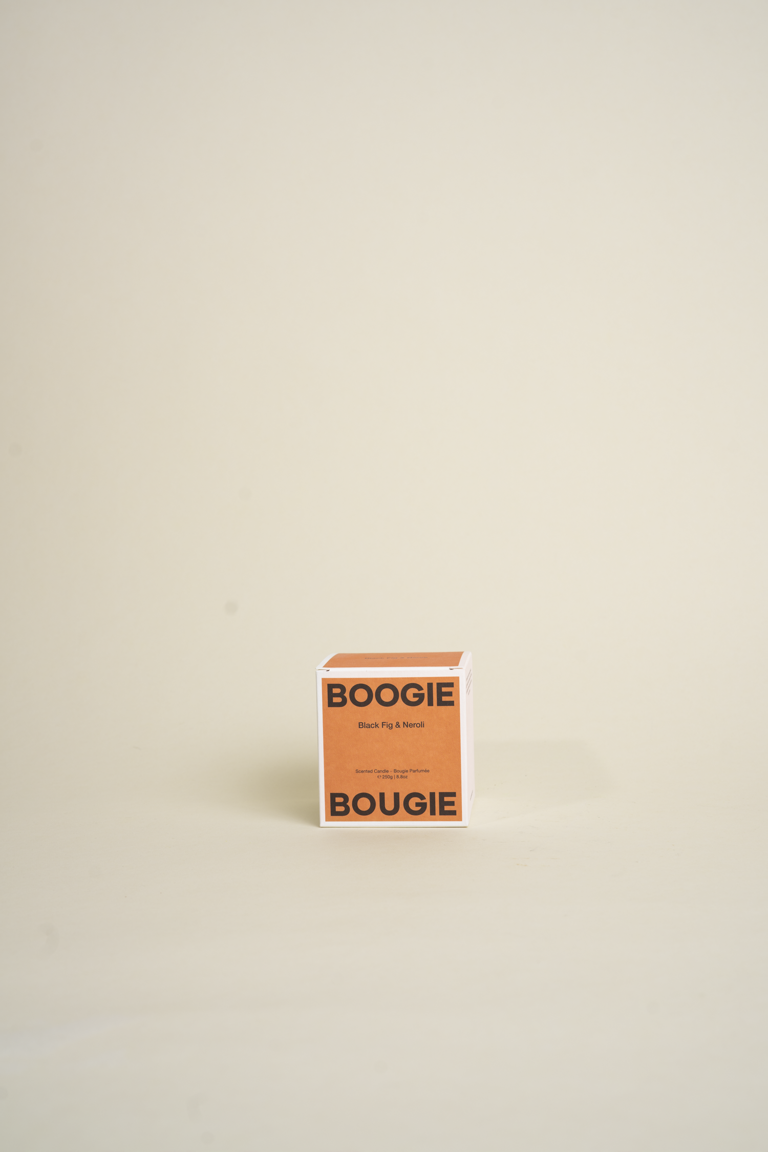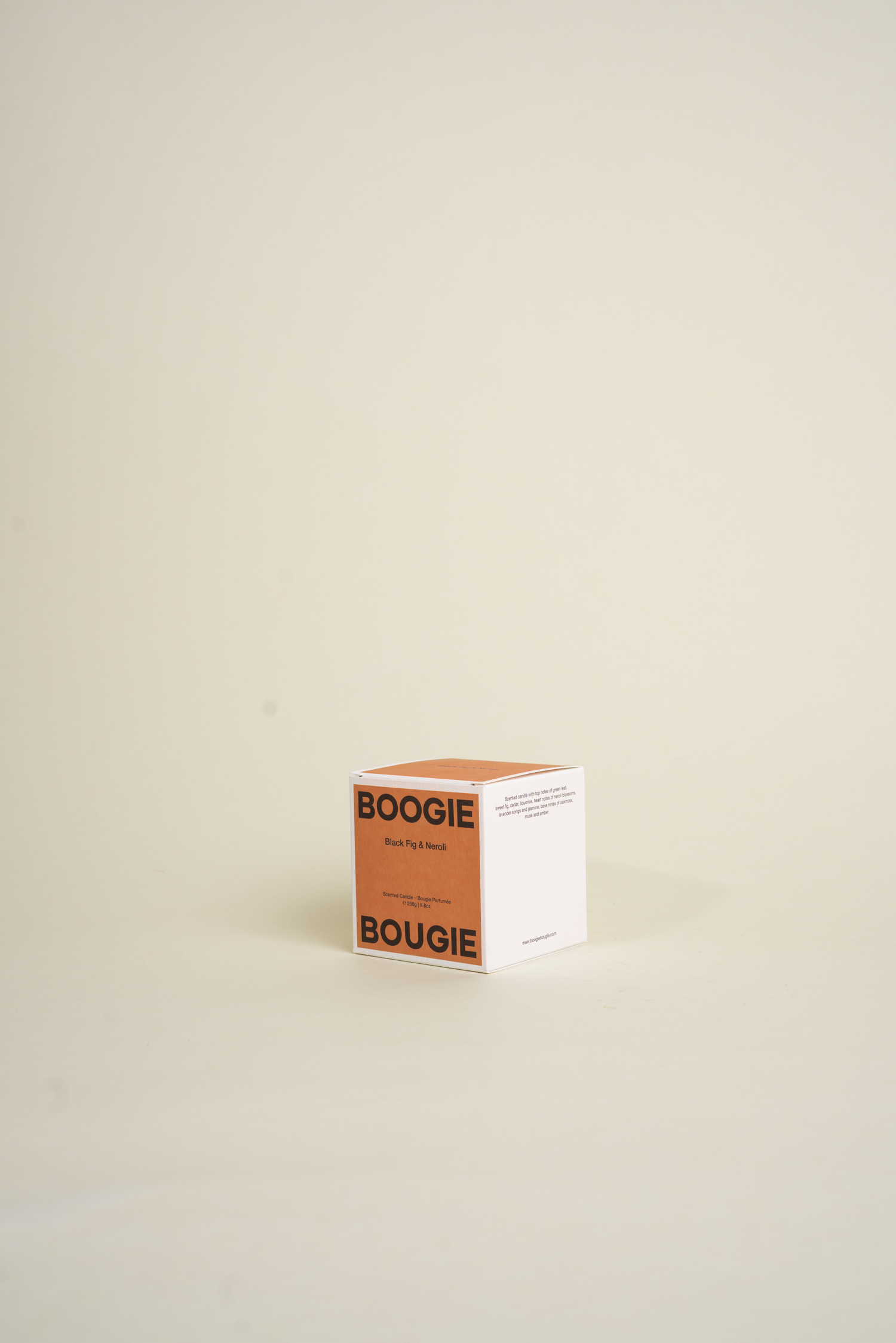 Scented candle by Boogie Bougie with heavenly top notes of green leaf, sweet fig, cedar, liquorice, heart notes of neroli blossoms, lavender sprigs and jasmine,