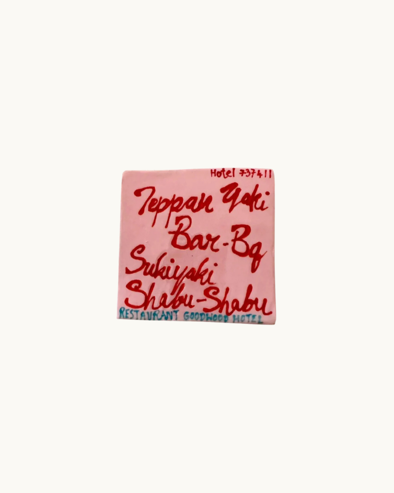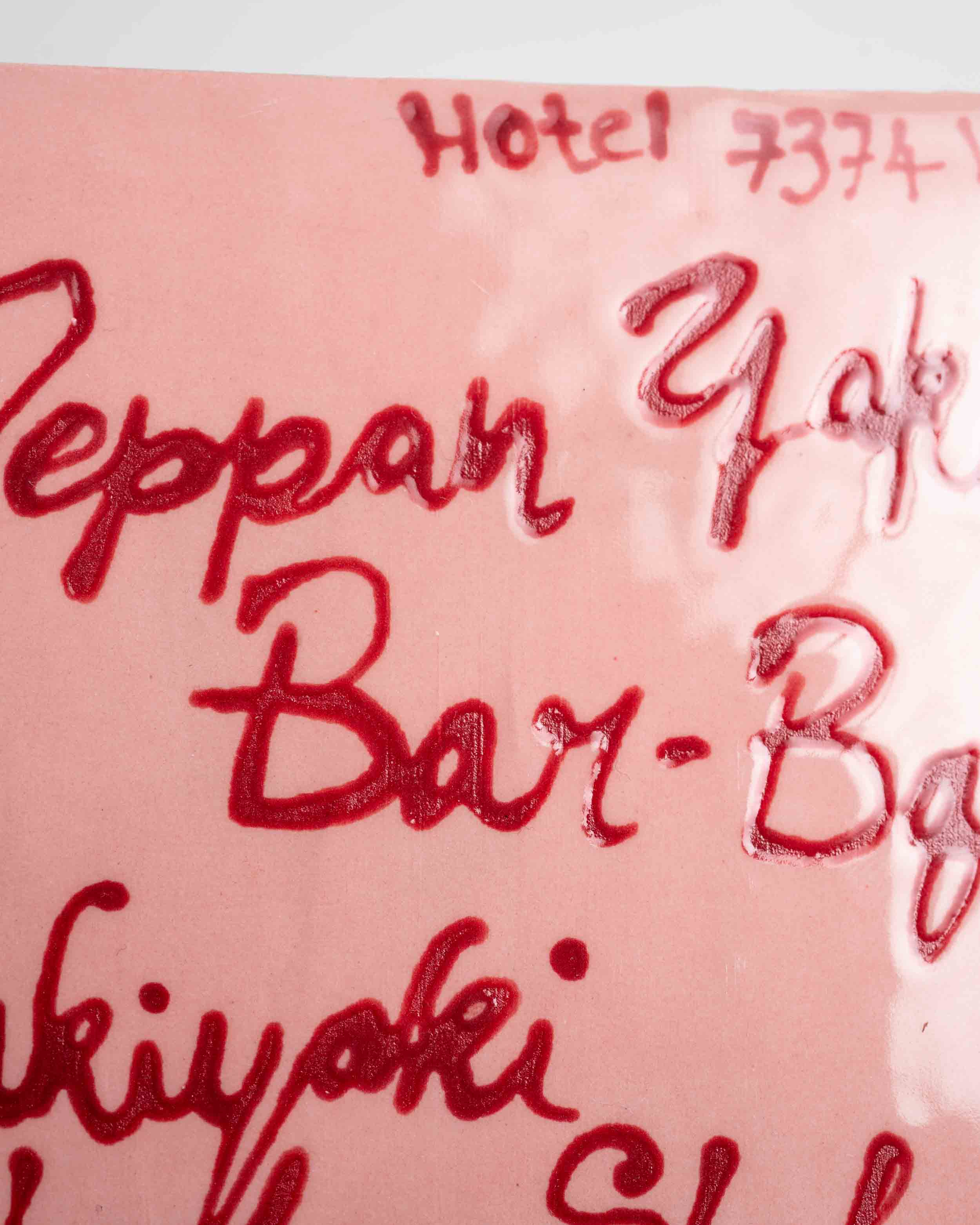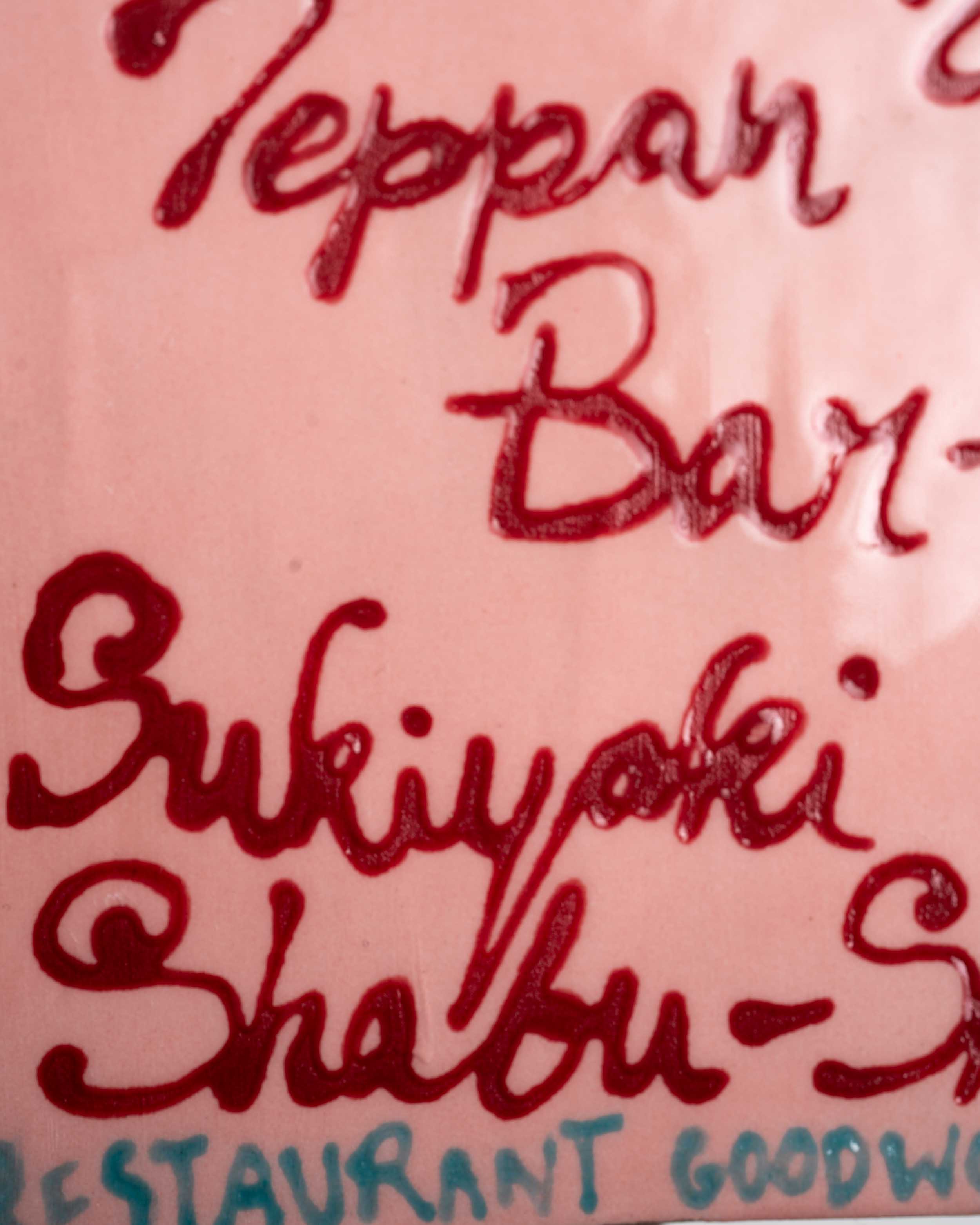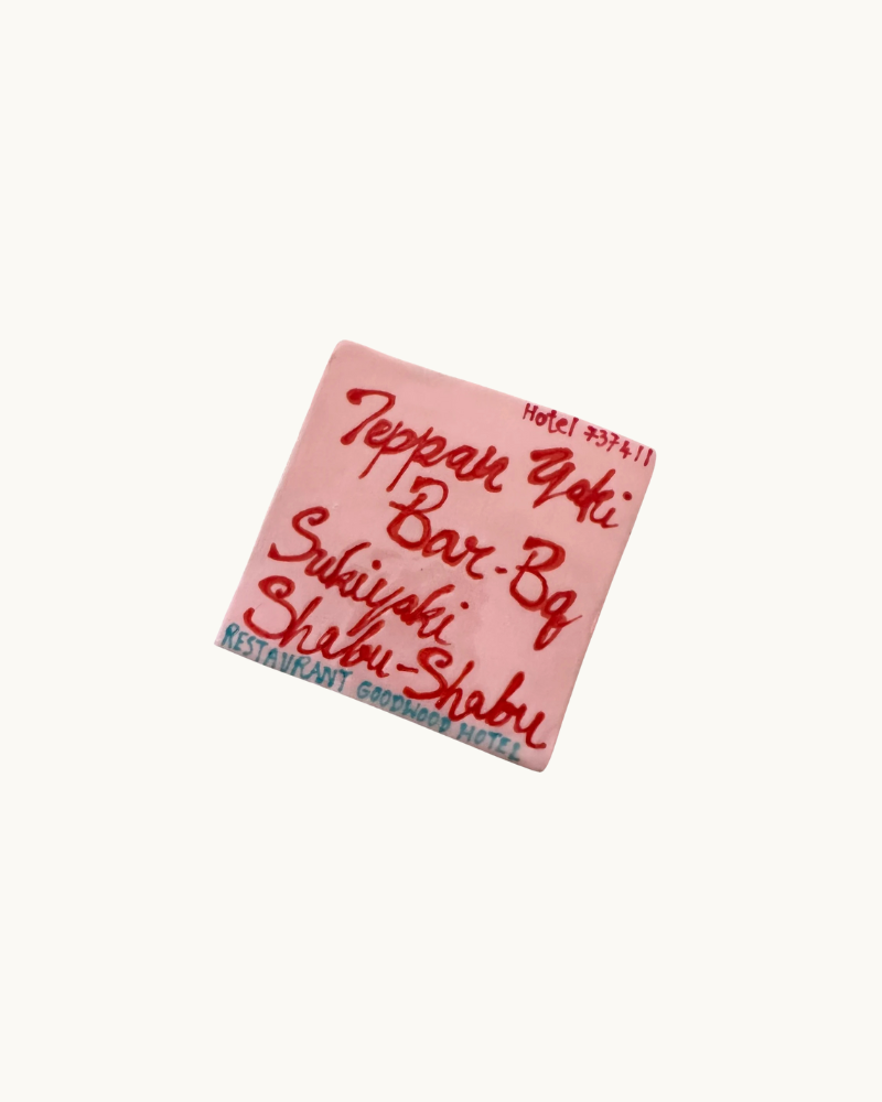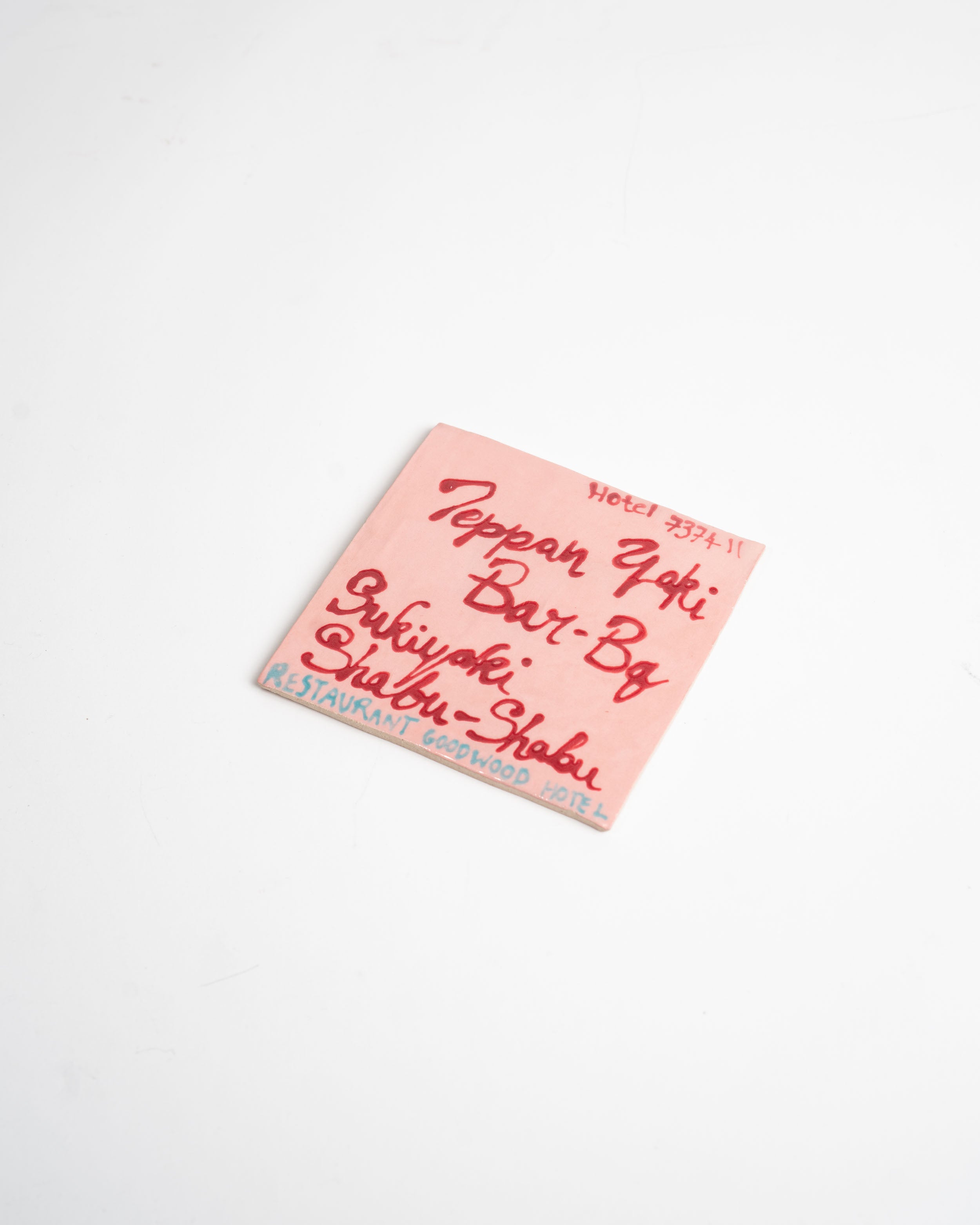 The Teppan Yaki Bar Coaster by L&Clay Ceramics features a pink base and red underglaze text.