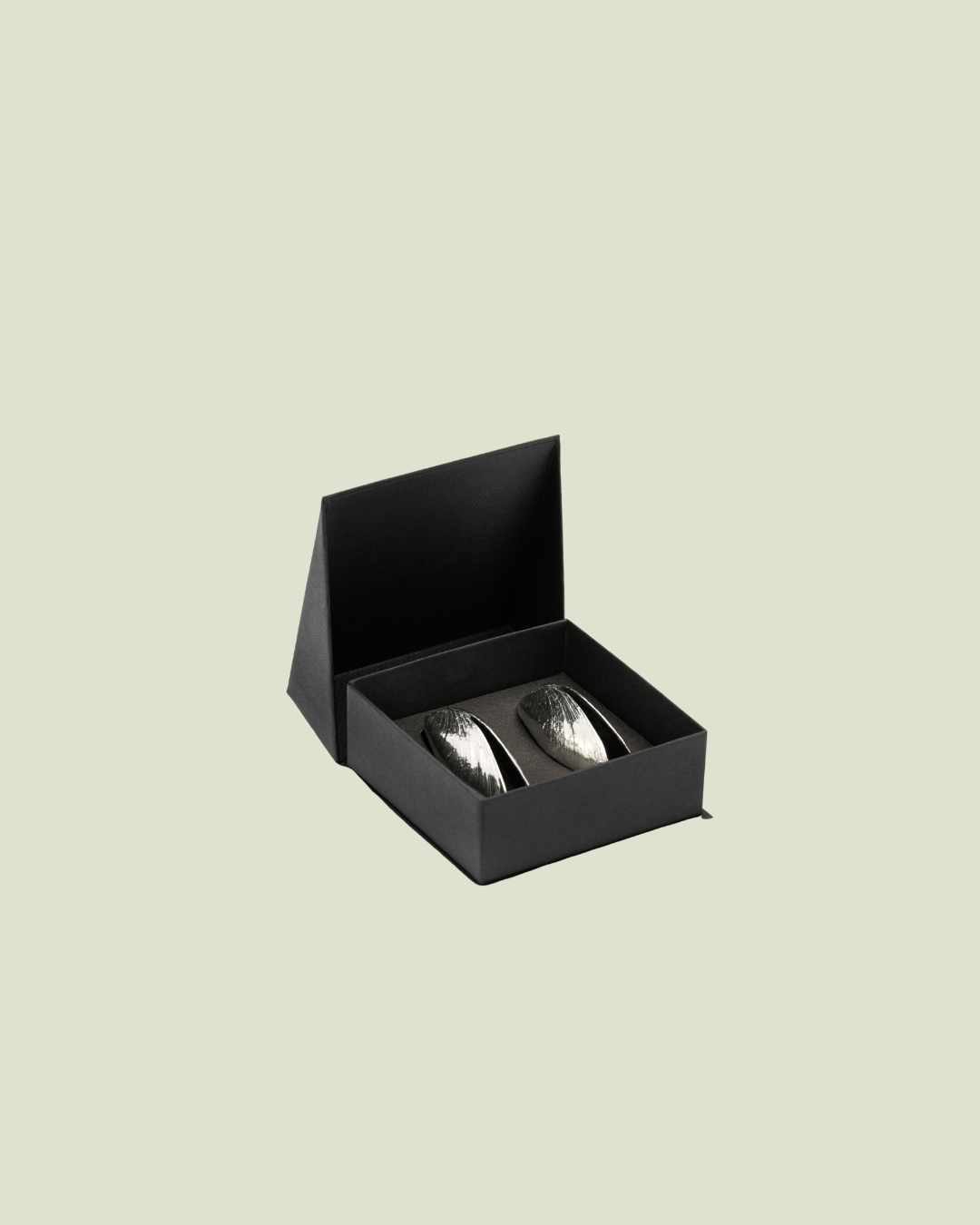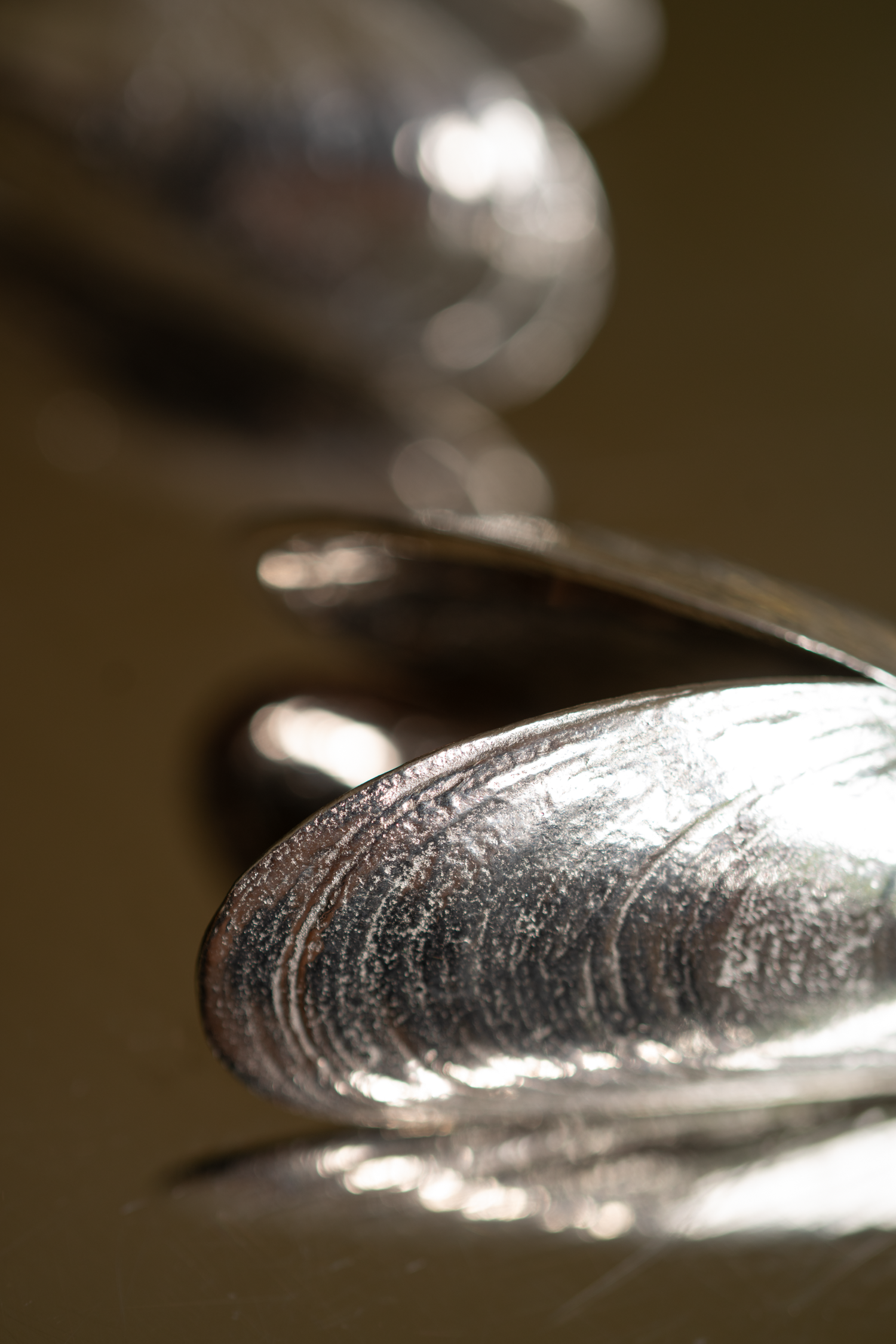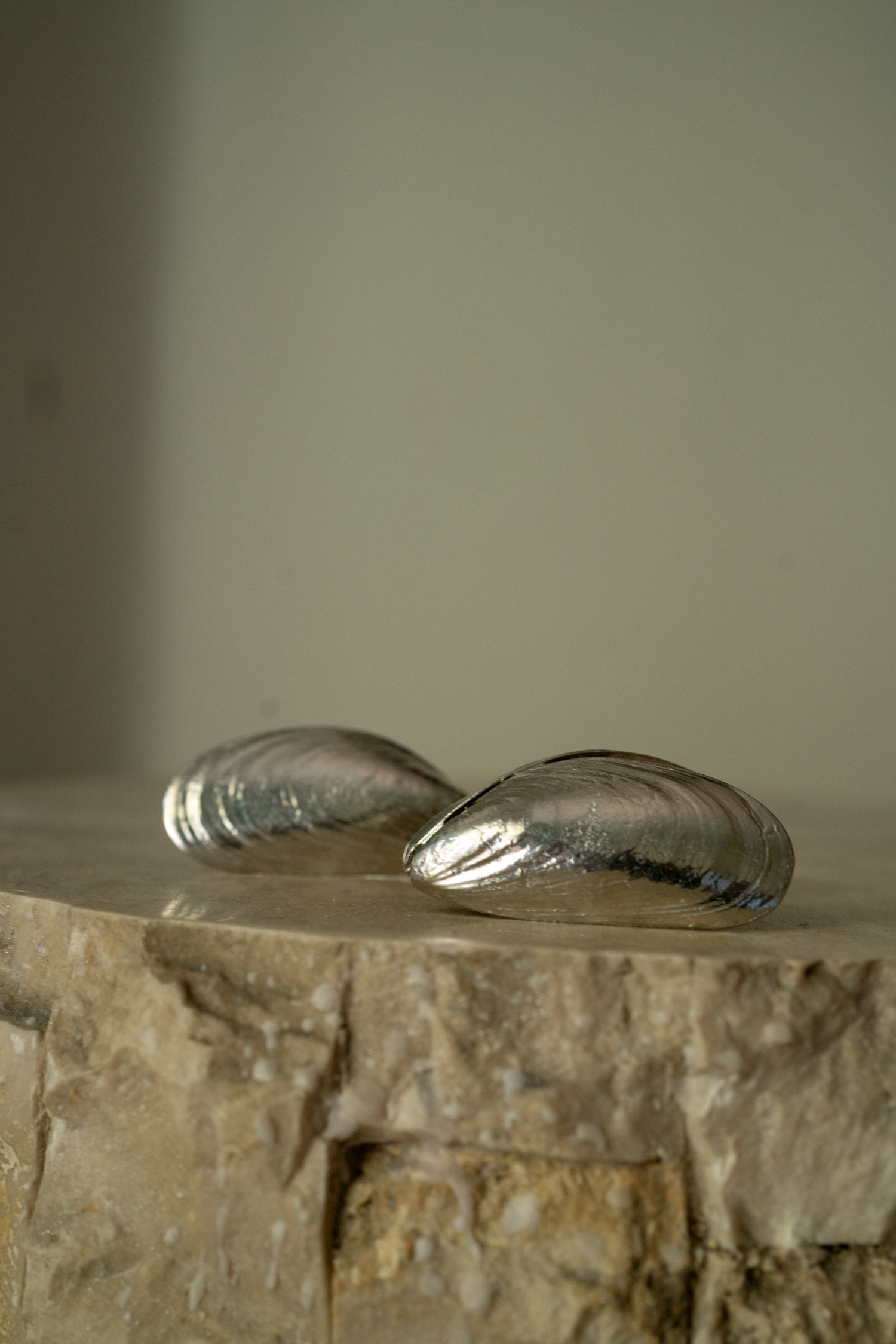 Each set includes two mussel-shaped utensils, designed with a spring mechanism that mimics the movement of a real mussel shell — both functional and sculptural.