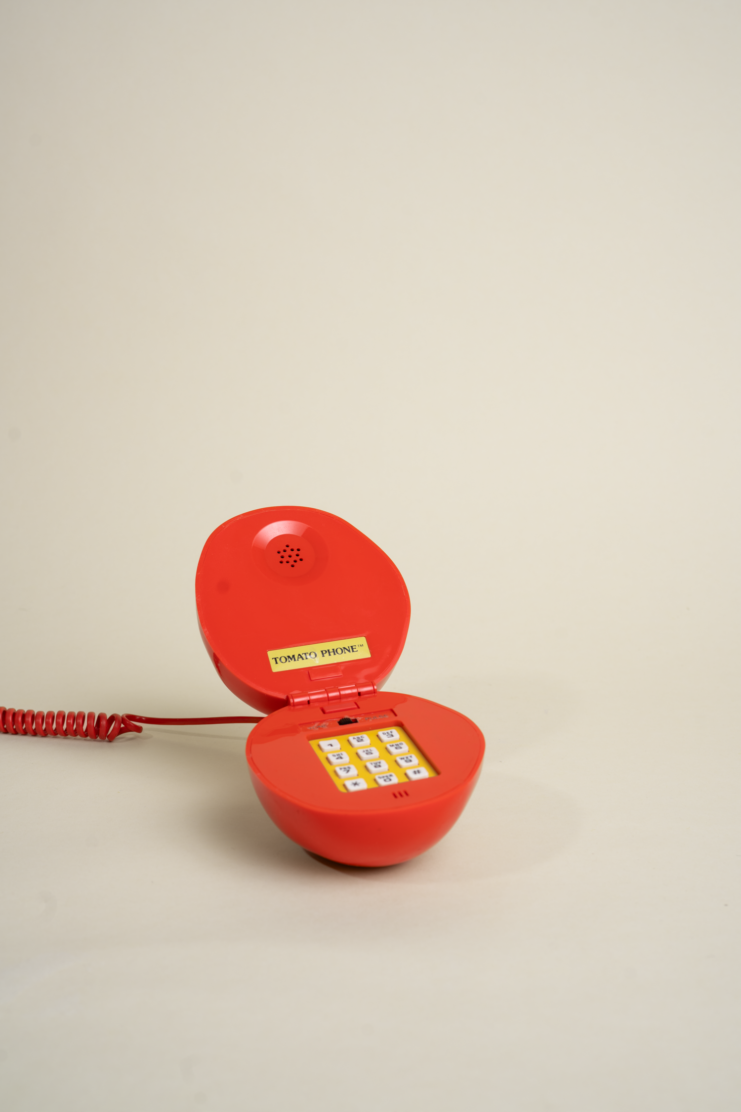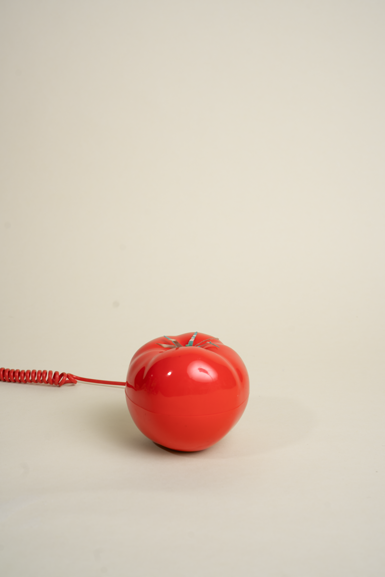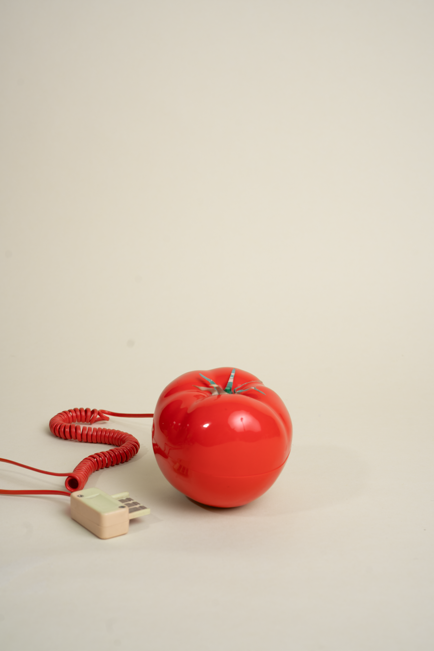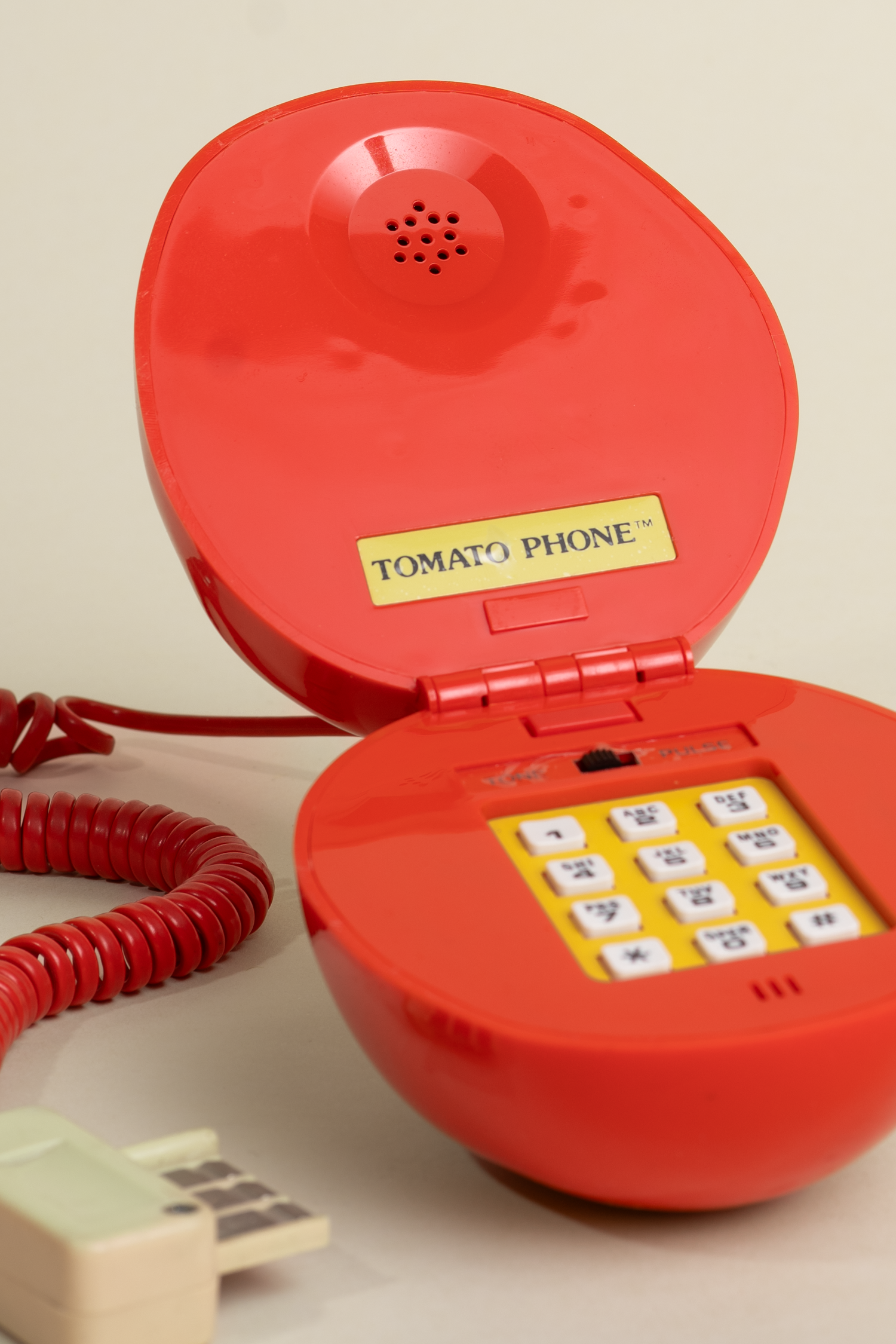 Plastic landline phone in the shape of a tomato, with its glossy red shell and rounded curves. Part of a wave of playful novelty phones that popped up in the 1980s, when everyday objects were reimagined with humor and bold character. A light-hearted design piece that still makes people smile.